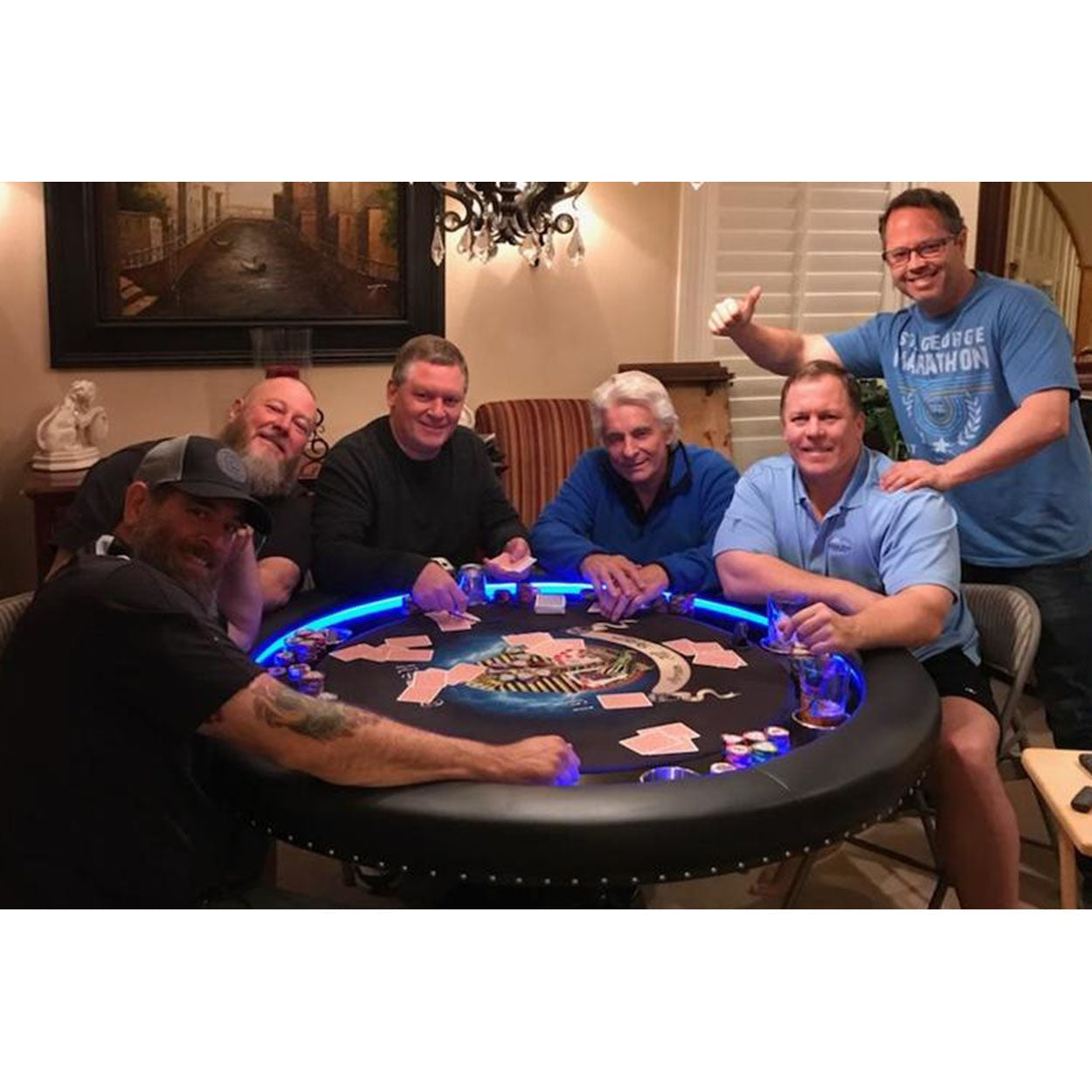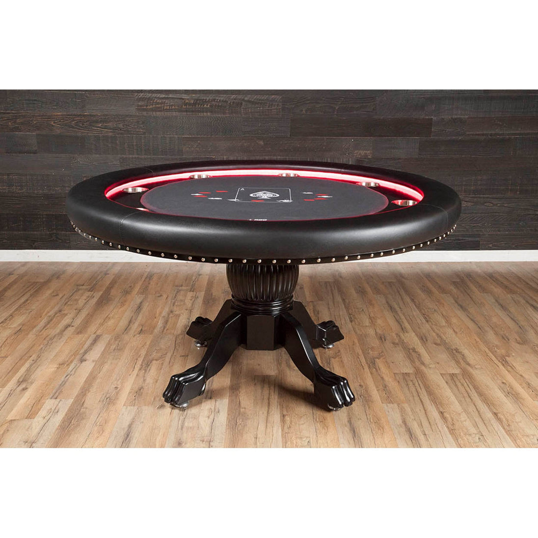 The remote-controlled LED lights give the table a great feel, while the round table shape comfortably accommodates up to 8 players. The Ginza fits in a comparatively smaller footprint than a long oval table requires. The Ginza is also well-suited for games where the deal rotates and with intimate play where everyone is an equally short distance from the pot.